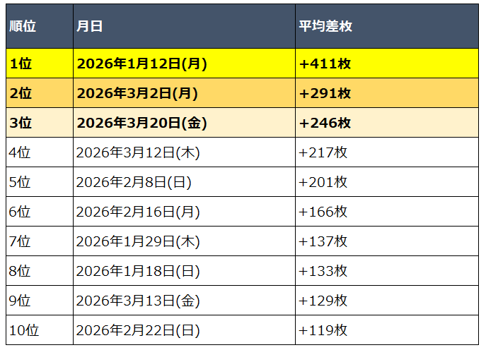 - 月日別 平均差枚ベスト5(再現性重視)